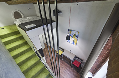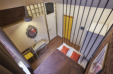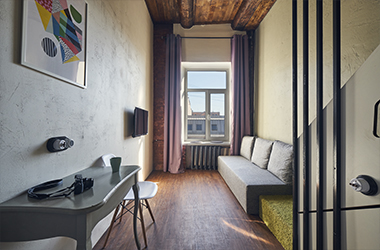 Узнать большеДвухуровневый номер. Окна выходят в тихий внутренний двор. Площадь номера: 15 кв.м. Кровать: двуспальная кровать 160 см*200 см Услуги и удобства: шкаф, телевизор, мини холодильник, душ и туалет в номере, бесплатные туалетные принадлежности, полотенца, бесплатный wi-fi. Максимальная вместимость номера – 2 гостя.